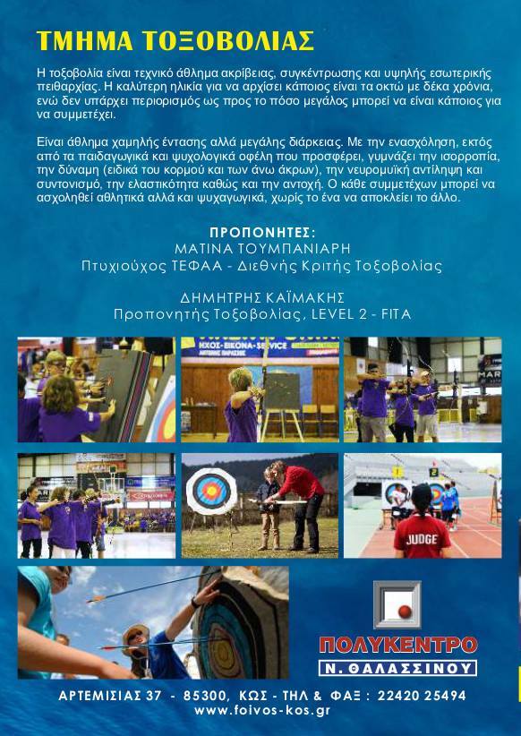 Συνεχίζονται οι εγγραφές στα τμήματα μπάσκετ και τοξοβολίας του συλλόγου μας. Οι γονείς των αθλητών μπορούν να προσέρχονται στο γραφείο του συλλόγου μας, στο κλειστό γυμναστήριο Κω, κάθε Δευτέρα,Τετάρτη,Παρασκευή 18:00-20:00 για να ενημερωθούν για τιςπ προπονήσειςτων τμημάτων.