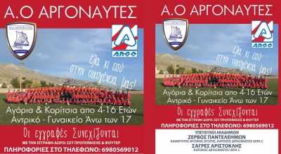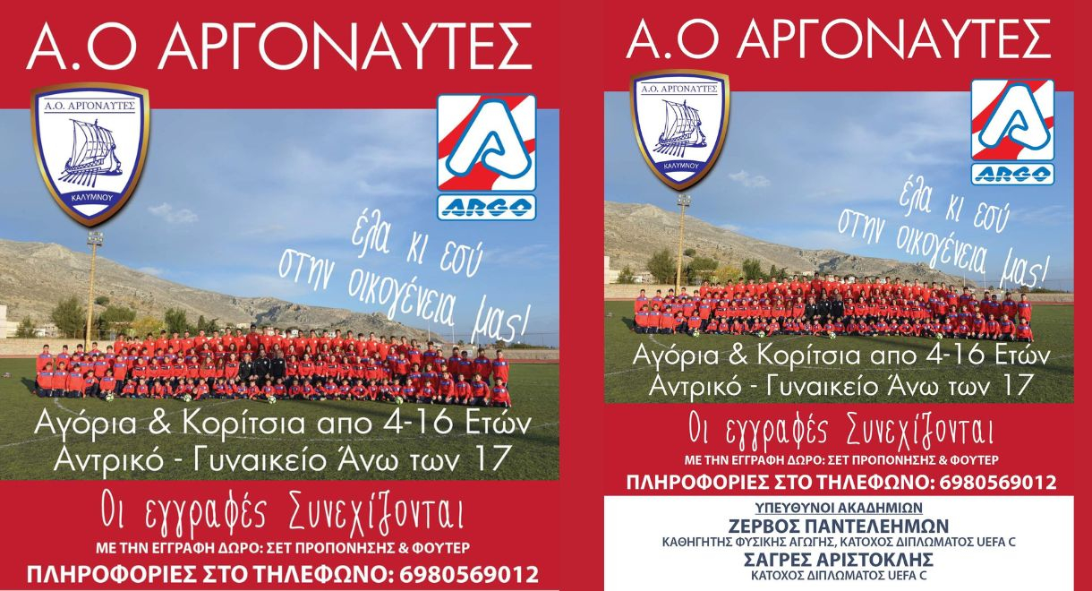 Συνεχίζονται με εντατικούς ρυθμούς οι εγγραφές στους Αργοναύτες Καλύμνου για τη νέα αγωνιστική χρονιά για αγόρια και κορίτσια από 4-16 ετών αλλά και για το ανδρικό και το γυναικείο τμήματα για ηλικίες άνω των 17 ετών.