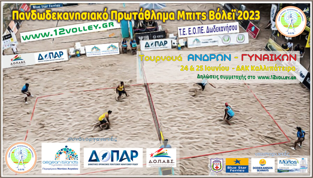 Η Τοπική Επιτροπή Βόλεϊ Δωδεκανήσου διοργανώνει το σαββατοκύριακο 24 & 25 Ιουνίου στο ΔΑΚ Καλλιπάτειρα τουρνουά μπιτς βόλεϊ για ανδρικές και γυναικείες ομάδες.
