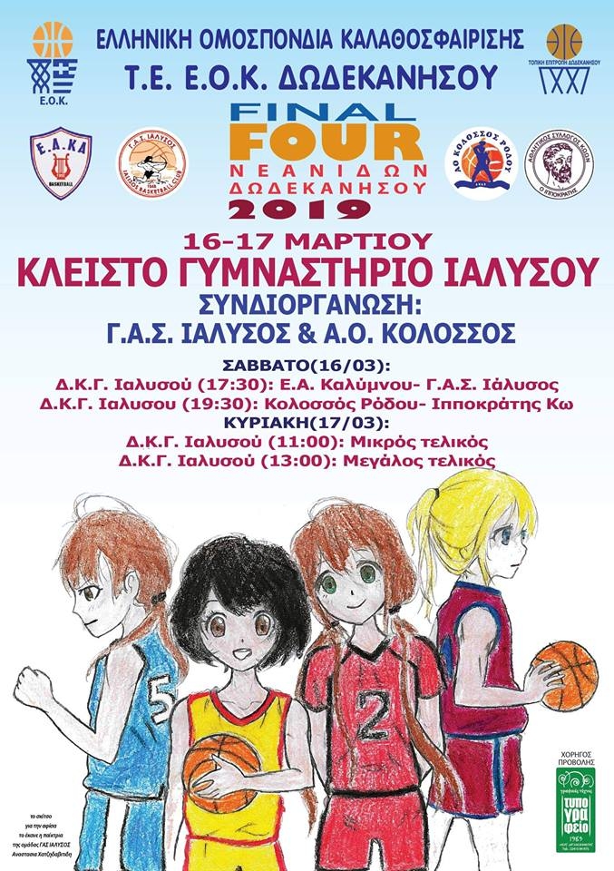 Το προσεχές σαββατοκύριακο θα διεξαχθεί στο κλειστό γυμναστήριο της Ιαλυσού, το φάιναλ-φορ του πρωταθλήματος των νεανίδων. Το 12sports σας παρουσιάζει σήμερα τα ρόστερ και των τεσσάρων ομάδων, που θα διεκδικήσουν τον τίτλο στα Δωδεκάνησα. Η πρωταθλήτρια μας ομάδα θα πρέπει να βρίσκεται από 20 έως 24 Απριλίου στην Αθήνα για να πάρει μέρος στην προκριματική φάση του πανελληνίου πρωταθλήματος. Κάτοχος του τίτλου είναι τα δύο τελευταία χρόνια η Ε.Α. Καλύμνου και το πρόγραμμα των αγώνων έχει ως εξής: