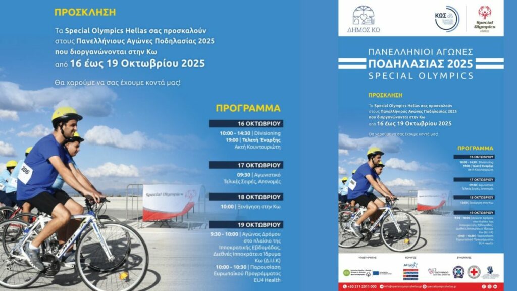 Για πρώτη φορά τα Special Olympics Hellas και ο Δήμος Κω συνδιοργανώνουν Πανελλήνιους Αγώνες Ποδηλασίας Special Olympics στην Κω, το νησί του ποδηλάτου. Οι Αγώνες υλοποιούνται 16-19 Οκτωβρίου με την συνεργασία του «Σβουρένειου Κ.Δ.ΑΠ. ΜΕΑ Δήμου Κω», της Ελληνικής Αστυνομίας και του Ερυθρού Σταυρού, καθώς και την υποστήριξη του Ευρωπαϊκού Προγράμματος EU4Health «Ενταξιακές Ομάδες Ανάδειξης Υγιεινού Τρόπου Ζωής σε Σχολεία & Φορείς».