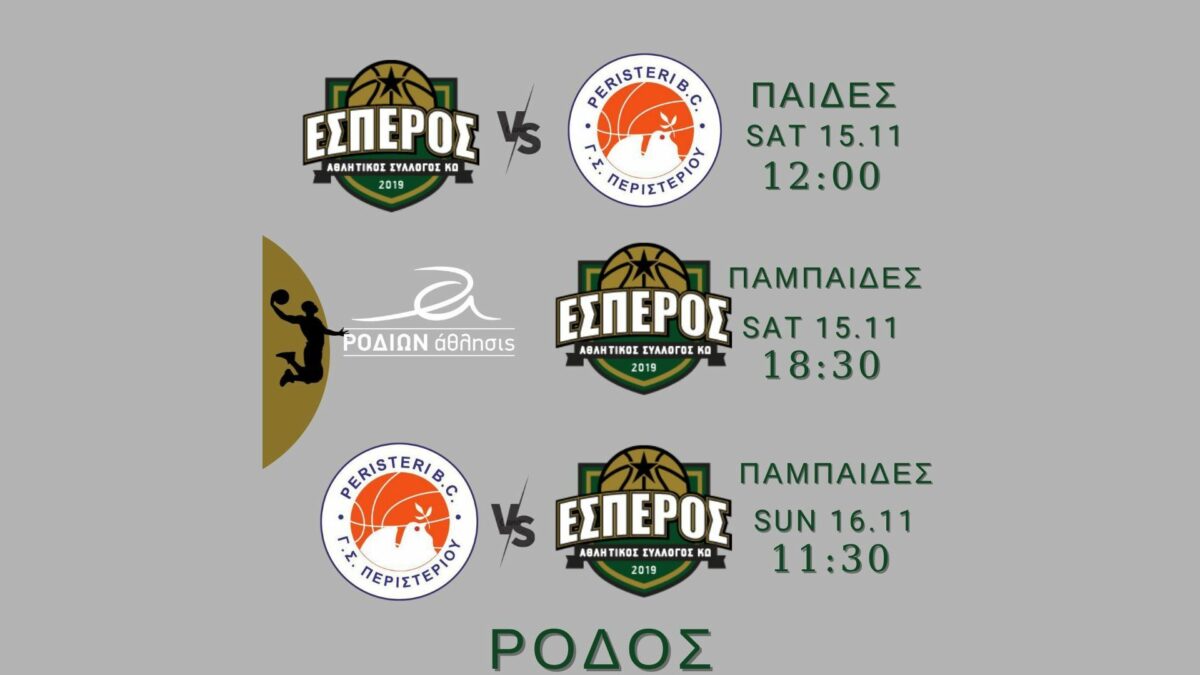 Το προσεχές Σαββατοκύριακο, τα τμήματα Παίδων και Παμπαίδων του Εσπέρου Κω θα ταξιδέψουν στη Ρόδο, όπου θα αντιμετωπίσουν μία από τις κορυφαίες ακαδημίες του ελληνικού μπάσκετ, το Περιστέρι και το Ροδίων Άθλησις.