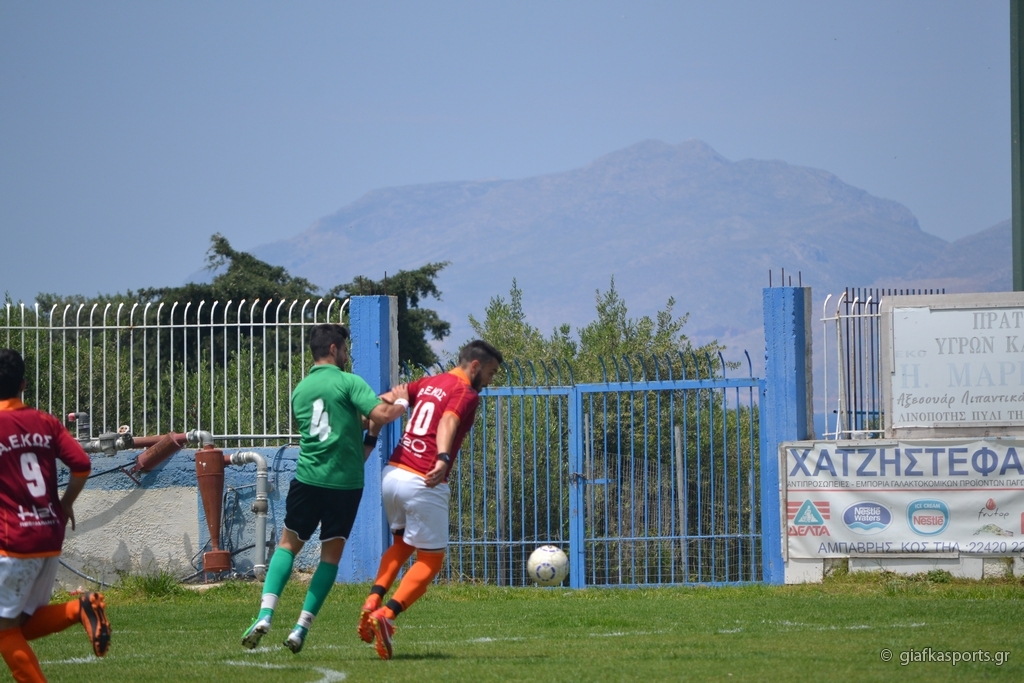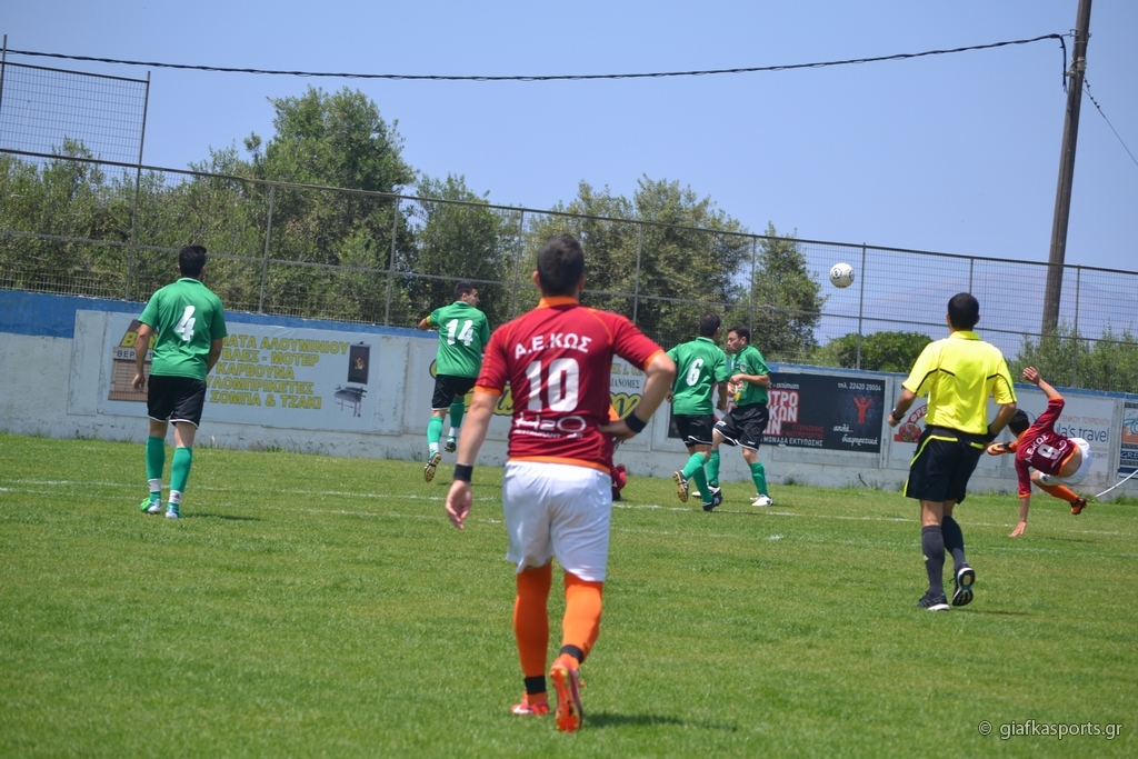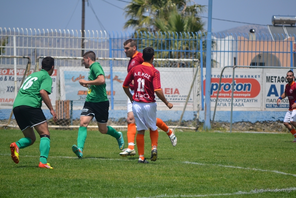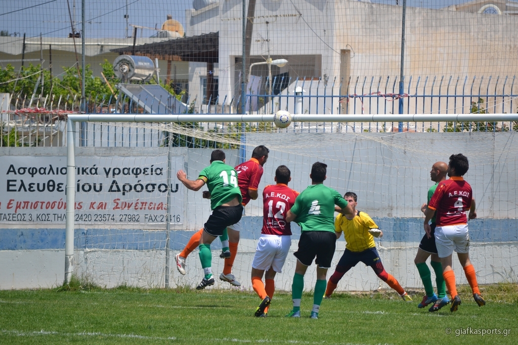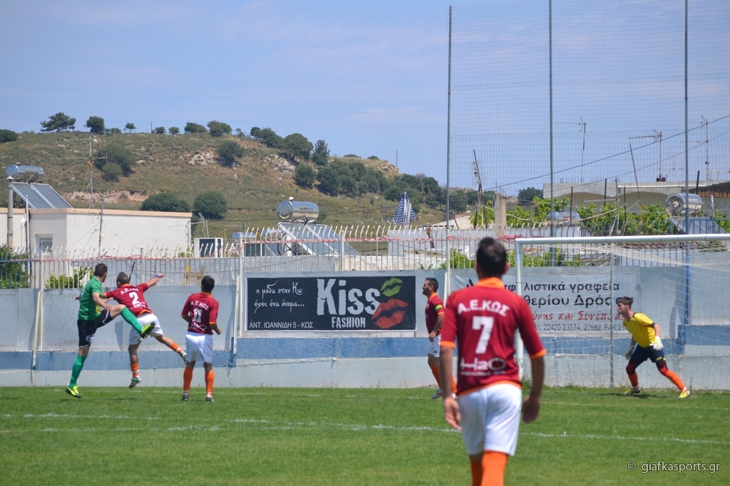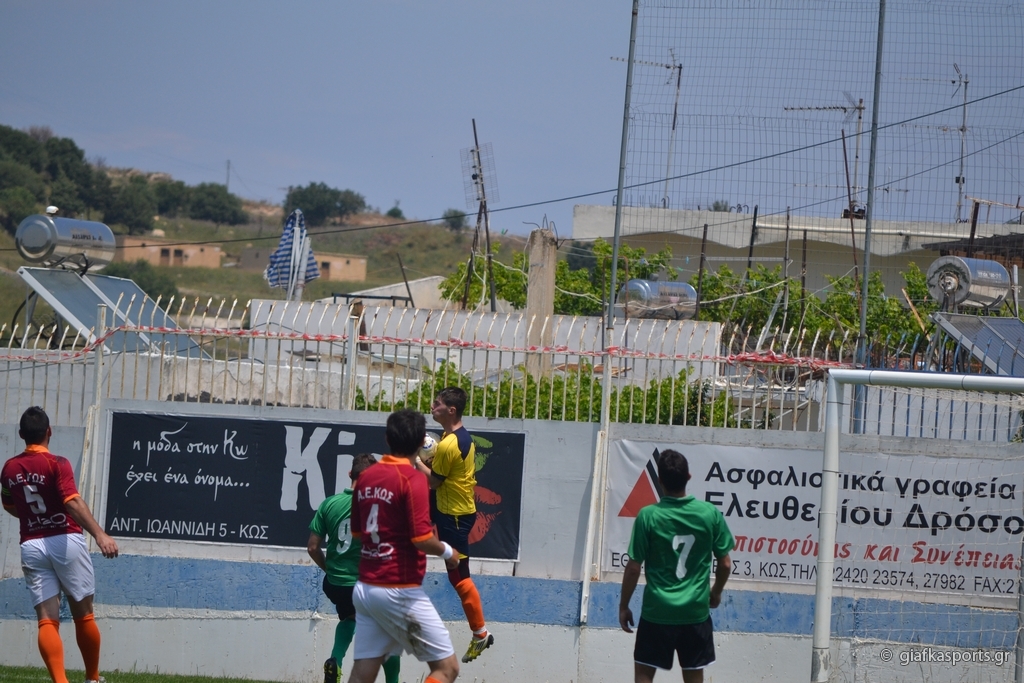 Την ήττα με 3-1 γνώρισε στο γήπεδο Πυλίου η Α.Ε Κως και έτσι ο Ευκλής Σορωνής θα είναι η ομάδα που θα περιμένει τον Ιάλυσο να ανέβει στην Γ’ Εθνική για να πανηγυρίσει με την σειρά του την άνοδο στην Α’ κατηγορία Δωδεκανήσου. Καλύτεροι στην μεγαλύτερη διάρκεια οι βυσσινί παρόλο που έχουν να προπονηθούν τουλάχιστον έναν μήνα αλλά προδόθηκαν από ατομικά λάθη και κούραση με την ομάδα του Μιχάλη Τσιβρινή στο τέλος να παίρνει τη νίκη.
