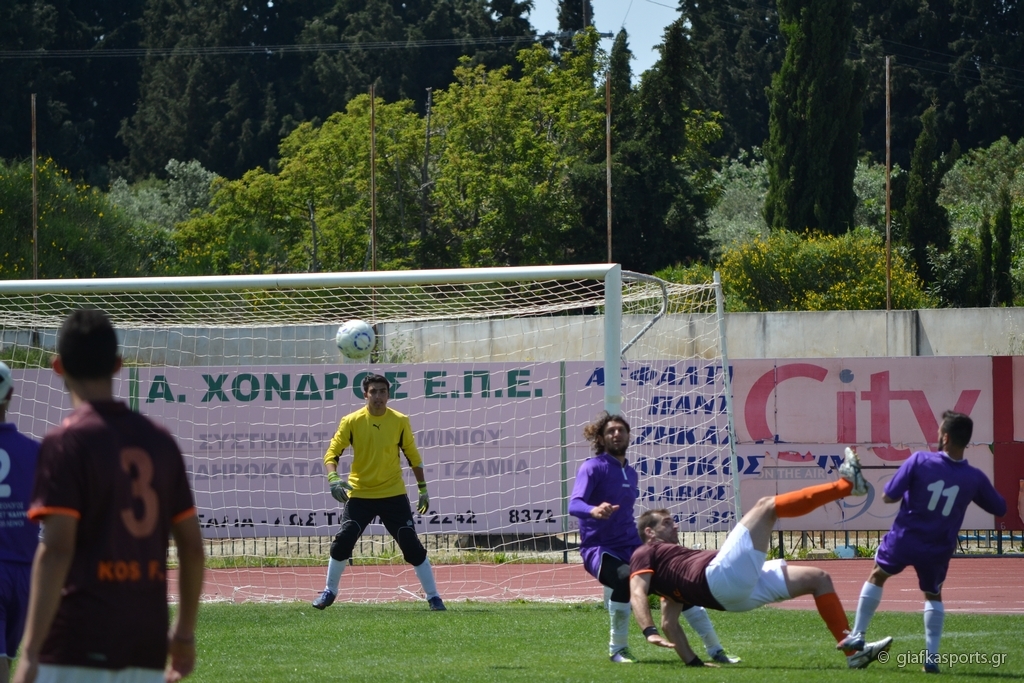 Μετά το πρώτο δεκάλεπτο η Α.Ε Κως ανέλαβε την πρωτοβουλία των κινήσεων και κατάφερε να ανοίξει το σκορ μόλις στο 14ο λεπτό όταν μετά από γύρισμα του Τζουμάκα η μπάλα κόντραρε στους αμυντικούς και κατέληξε στα δίχτυα ενώ τέσσερα λεπτά αργότερα μετά από ωραία παράλληλη πάσα του Τσάτσα ο Πης έκανε το 2-0 για τους «βυσσινί».