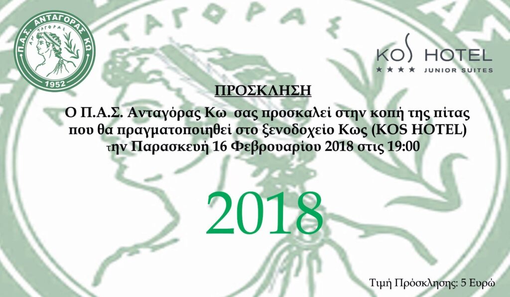 Ο Π.Α.Σ. Ανταγόρας Κω, σας προσκαλεί στην εκδήλωση για την κοπή της Πρωτοχρονιάτικης Βασιλόπιτας που θα πραγματοποιηθεί την Παρασκευή 16 Φεβρουαρίου 2018 και ώρα 19:00,στην αίθουσα του ξενοδοχείου Kos Junior Suites.