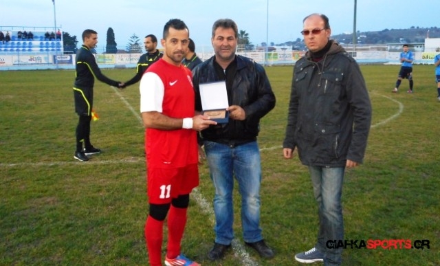Τιμητική πλακέτα παρέδωσε στον Μάκη Μποϊλή ο πρόεδρος του Α.Ο Δικαίου Χριστόδουλος Τσαμπουνιάρης λίγο πριν την έναρξη του αγώνα κυπέλλου ανάμεσα σε Δίκαιο και Αντίμαχο.