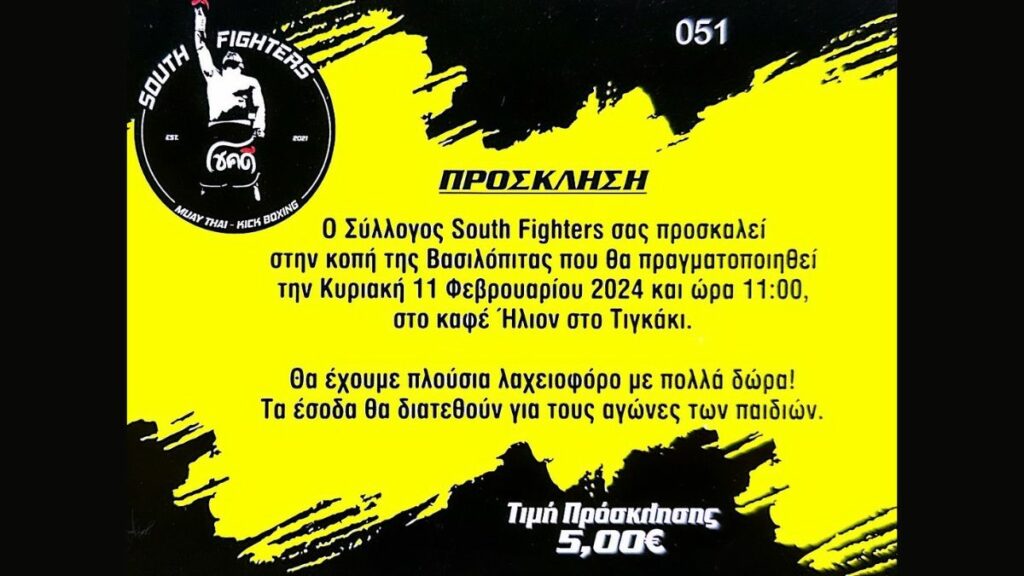 O σύλλογος South Fighters σας προσκαλεί στην κοπή της βασιλόπιτας που θα πραγματοποιηθεί την Κυριακή 11 Φεβρουαρίου 2024 και ώρα 11:00 στο καφέ Ήλιον στο Τιγκάκι. Θα έχουμε πλούσιο λαχειοφόρο με πολλά δώρα. Τα έσοδα θα διατεθούν για τους αγώνες των παιδιών.