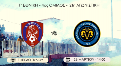 Για την 21η αγωνιστική της Γ’ Εθνικής (4ος Όμιλος) ο Α.Ο Πυλίου υποδέχεται την Κυριακή στις 14:00 στο γήπεδο Πυλίου τον Α.Ο Διαβολιτσίου. Καλούμε το φίλαθλο κοινό να δώσει δυναμικό παρών σε ένα σημαντικό παιχνίδι για την ομάδα μας και όλοι μαζί να πανηγυρίσουμε τη νίκη που θα μας φέρει ακόμη πιο κοντά στην επίτευξη των στόχων μας.