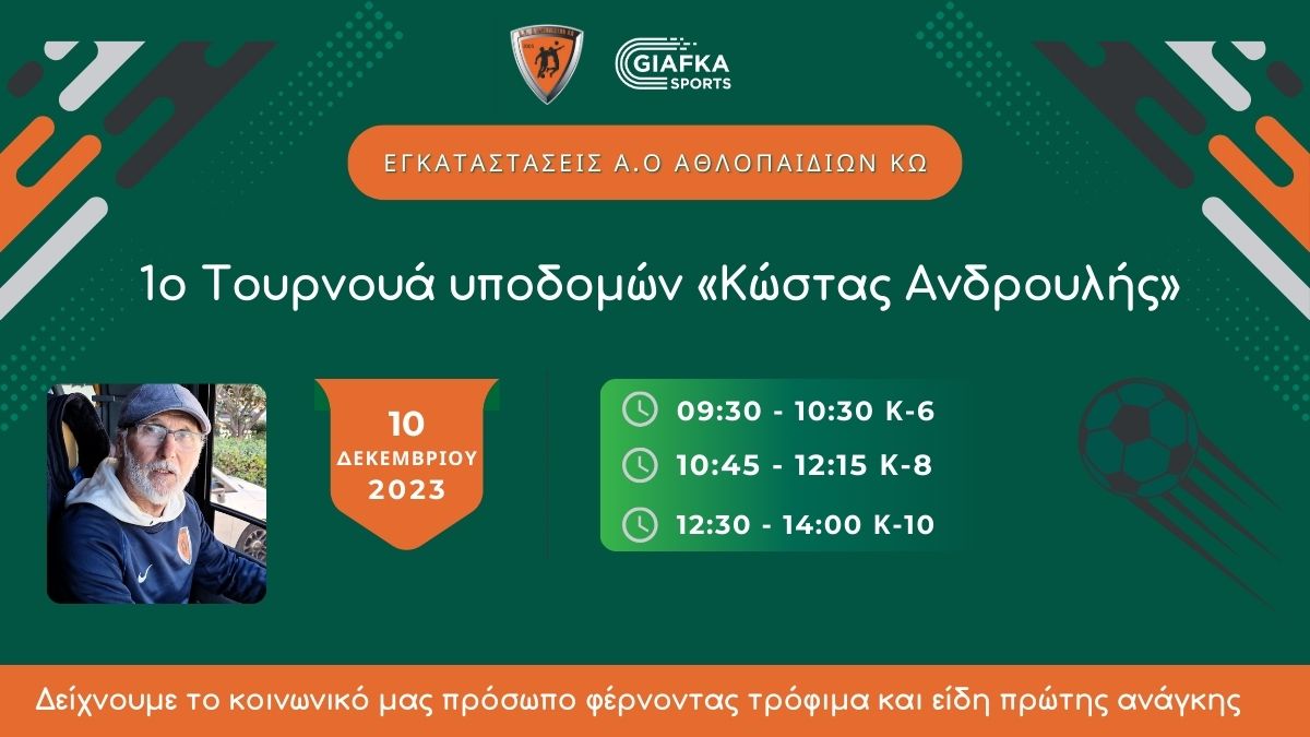 Την Κυριακή 10 Δεκεμβρίου θα πραγματοποιηθεί στις εγκαταστάσεις του Α.Ο Αθλοπαιδιών Κω το 1ο τουρνουά υποδομών που είναι αφιερωμένο στην μνήμη του Κώστα Ανδρουλή. Ο Γιάννης Μανούσογλου και οι άνθρωποι του Ομίλου θέλησαν με αυτόν τον τρόπο να τιμήσουν τον δικό τους Κώστα που αφιέρωσε μεγάλο μέρος της ζωής του δίνοντας τις γνώσεις του στα μικρά παιδιά.