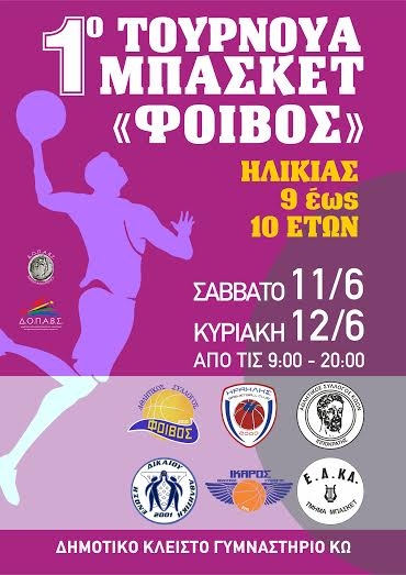 Το διήμερο 11 και 12 Ιουνίου θα διεξαχθεί το 1ο τουρνουά μπάσκετ του Φοίβου Κω για παιδιά γεννηθέντα τις χρονιές 2005 και 2006. Οι αγώνες θα διεξαχθούν σε τέσσερις περιόδους των 8 λεπτών. Σε κάθε περίοδο γίνεται υποχρεωτικά αλλαγή πεντάδας, εκτός από την 4η περίοδο όπου θα υπάρχει ελεύθερη συμμετοχή αθλητών από τον προπονητή τους. Η ΣΥΜΜΕΤΟΧΗ ΟΛΩΝ ΤΩΝ ΑΘΛΗΤΩΝ ΕΙΝΑΙ ΥΠΟΧΡΕΩΤΙΚΗ. Στις απονομές των παιδιών, θα δοθεί Αναμνηστικό Δίπλωμα. Όσο για την κατάταξη, σκοπός μας είναι στο τουρνουά να μην υπάρχει σκορ κι ούτε βαθμολογικές θέσεις. Στο τουρνουά θα πάρουν μέρος εκτός από τους διοργανωτές, ο Ιπποκράτης Κω, η Α.Ε. Δικαίου, ο Ηρακλής 2000, η Ε.Α. Καλύμνου και ο Ίκαρος Κω.