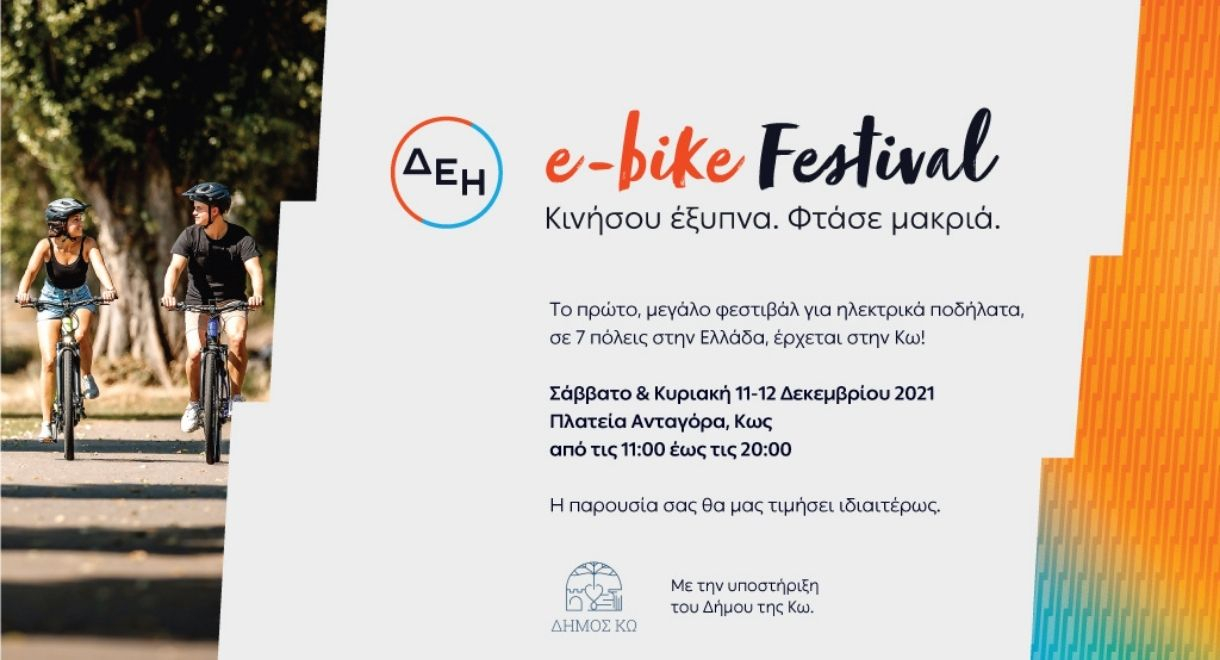 Το ΔΕΗe–bikeFestivalέρχεται το Σαββατοκύριακο 11-12 Δεκεμβρίου 2021στην Πλατεία Ανταγόραστο κέντρο της πόλης της Κω, συγκεντρώνοντας για πρώτη φορά, περισσότερα από 50 διαφορετικά μοντέλα ηλεκτρικών ποδηλάτων για κάθε χρήση.