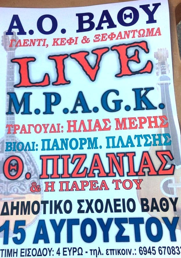 Ελάτε να διασκεδάσουμε όλοι μαζί με τις ορχήστρες των MPAGK με τους Μανώλη & Χρήστο Βορδόχειλα, Άρη Νίννη, Μανώλη Πανάτο, Κυριάκο Κελεμπέση, Πλάτση Πανορμίτης σε λαϊκό και παραδοσιακό πρόγραμμα και το Θέμελη Πιζάνια με τη παρέα του σε κρητικό γλέντι.