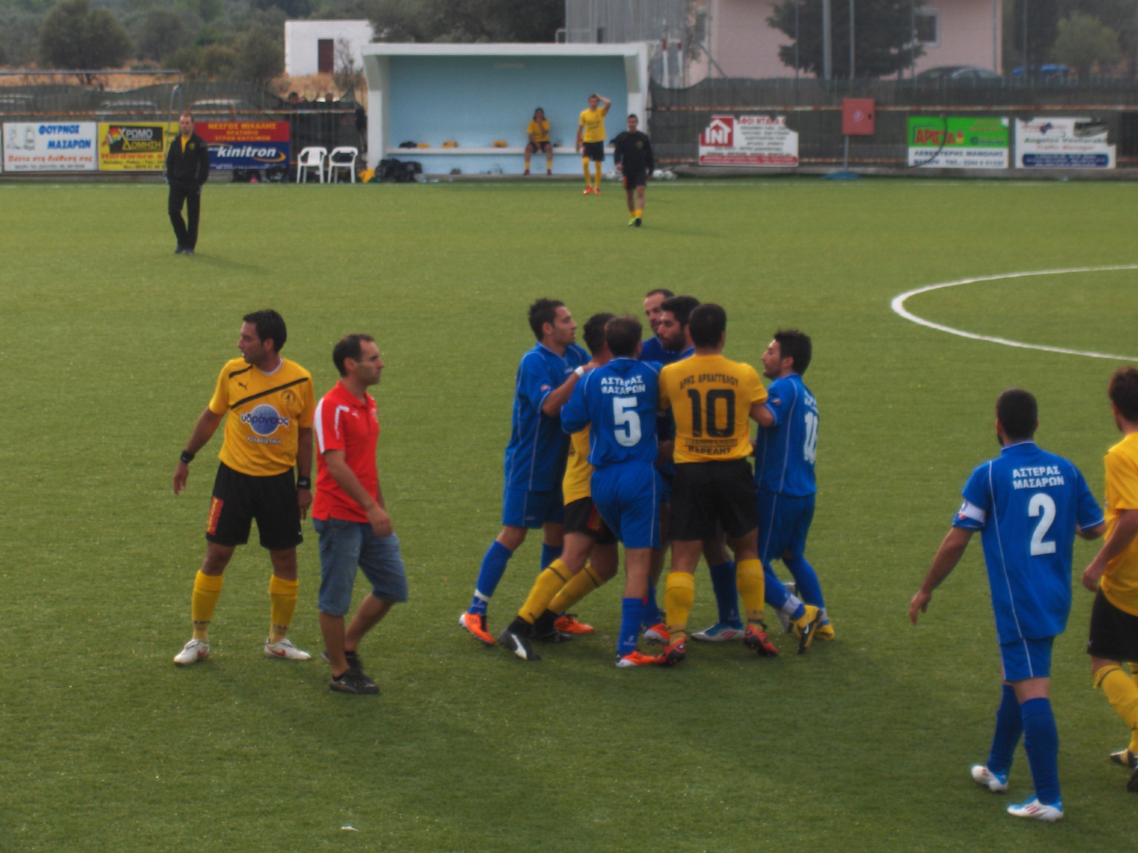 Ανοιχτό παιχνίδι στο ξεκίνημα, που θα έλεγε κανείς ότι προμήνυε αυτό που θα ακολουθήσει στην συνέχεια και στην πανδαισία γκολ την οποία παρακολουθήσαμε. Ο Άρης που ήταν ένα κλικ ανώτερος κατάφερε να προηγηθεί στο 25΄ με τον Παπαοικονόμου από κοντά, αλλά στην αμέσως επόμενη φάση ήρθε η απάντηση του Αστέρα εν μέσω διαμαρτυριών και αποβολών. Ο διαιτητής Πατσιόπουλος καταλόγισε πολύ αυστηρά πέναλτυ μετά από τράβηγμα του Τσελεπίδη στον Πλαγγέντη, που ως συνέπεια είχε και την αποβολή του ποδοσφαιριστή του Άρη. Για 10 λεπτά δεν παίχτηκε ποδόσφαιρο και στο γήπεδο επικράτησαν οι συμπλοκές μεταξύ των ποδοσφαιριστών. Αυτό απέφερε και την κόκκινη κάρτα στον Μουδάτσο για εξύβριση προς τον επόπτη. Μετά την διακοπή Αμπελάς ευστόχησε από τα 11 μέτρα και έφερε το ματς στα ίσα. Ο Αστέρας που ήταν καλύτερος στην συνέχεια, έφτασε στην ανατροπή με την λήξη του πρώτου ημιχρόνου χάρη στο γκολ του Πλαγγέντη. Στο δεύτερο ημίχρονο η ομάδα του Στάθη Φαρμακίδη πίεζε ασφυκτικά για την ισοφάριση και κατάφερε με το απευθείας χτύπημα φάουλ του Κοτσίκου στο 66΄. Ο Αστέρας και πάλι όμως είχε την δική του απάντηση, καθώς επτά λεπτά αργότερα έφτασε στο 3-2 με το κοντινό πλασέ του Πλαγγέντη. Το παιχνίδι είχε πάρει άγρια ομορφιά, καθώς ένα λεπτό αργότερα ο Μαρκόπουλος με κεφαλιά ισοφάρισε εκ νέου για τον Άρη, για να δώσει όμως και πάλι δύο το προβάδισμα στον Αστέρα ο Αμπελάς. Στο 82΄ ο Μαρκόπουλος με πανομοιότυπο τρόπο έφερε για ακόμα μια φορά το ματς στα ίσα και έφερε στο μυαλό όλων σκηνές από το περσινό ματς των δύο ομάδων για την Β Κατηγορία (Είχε λήξει 4-4). Ο Αστέρας έμεινε με 9 παίκτες στο 85΄, όταν ο Νεσγός ανέτρεψε τον Ξύπα σαν τελευταίο παίκτη έξω από την περιοχή, αλλά κατάφερε στο φινάλε να πάρει την νίκη με την εξαιρετική αντεπίθεση και το πλασέ του Μίρτσεφ. Αναμφίβολα έχουμε χρόνια να δούμε στο τοπικό μας ποδόσφαιρο τέτοιο ματς. Το οποίο βέβαια παραλίγο να χαλάσει στο 26΄ μετά την απόφαση του Θωμά Πατσιόυλου.