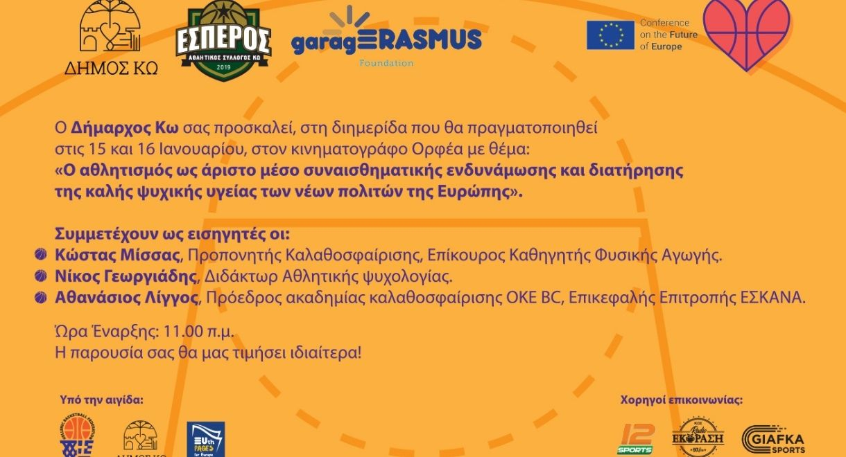 στο πλαίσιο των εκδηλώσεων της Διάσκεψης για το Μέλλον της Ευρώπης (Conference on the Future of Europe), συνδιοργανώνει ο Δήμος Κω, με τον οργανισμό GaragErasmus και την πρέσβειρα 4EUFuture κα Ελευθερία Σκέτου, τον Αθλητικό Σύλλογο «ΕΣΠΕΡΟΣ ΚΩ» και την Ελληνική Ομοσπονδία Καλαθοσφαίρισης.