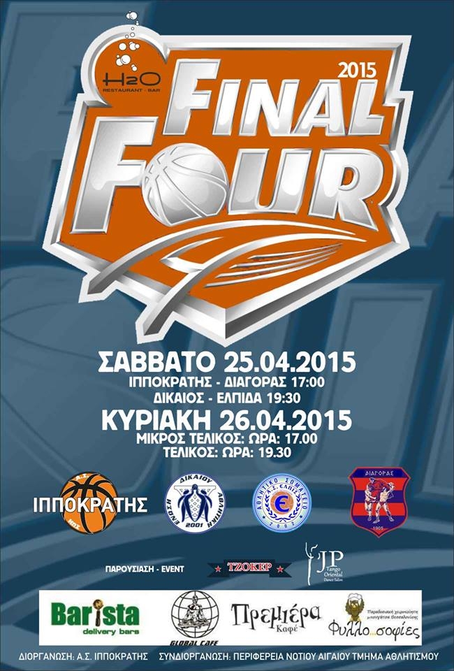 Το Σάββατο 25 και την Κυριακή 26 Απριλίου, διεξάγεται στο κλειστό γυμναστήριο της Κω το φάιναλ-φορ του ανδρικού πρωταθλήματος για την ανάδειξη του πρωταθλητή Δωδεκανήσου της σεζόν 2014-15. Την ευθύνη για το φάιναλ-φορ έχει ο ΑΣ Ιπποκράτης Κω, με συνδιοργανωτή, το τμήμα αθλητισμού της περιφέρειας νοτίου Αιγαίου. Οι ομάδες που συμμετέχουν είναι: ΑΣ ΙΠΠΟΚΡΑΤΗΣ ΚΩ, Α.Ε. ΔΙΚΑΙΟΥ, ΕΛΠΙΣ ΠΕΤΑΛΟΥΔΩΝ, ΔΙΑΓΟΡΑΣ ΡΟΔΟΥ.