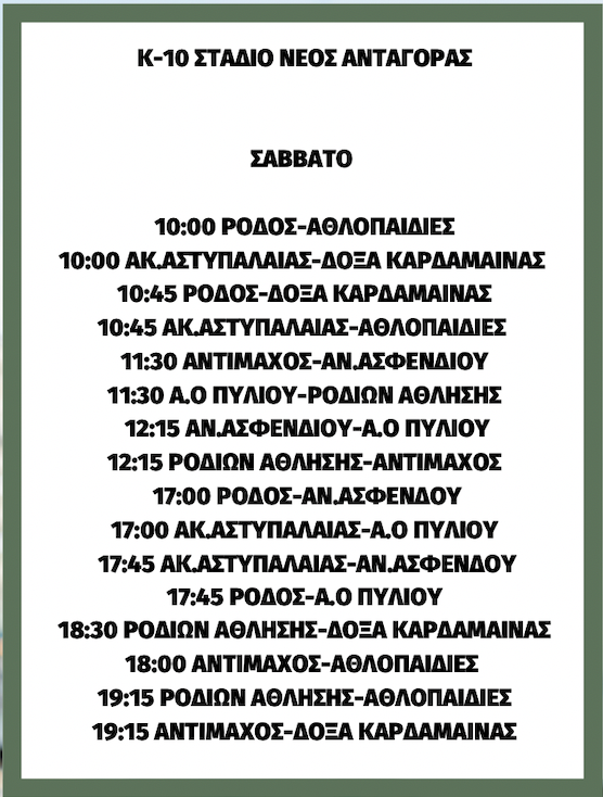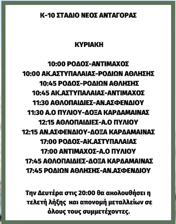 To τριήμερο Σάββατο – Κυριακή – Δευτέρα θα διεξαχθεί το Kos Youth Festival 2022 με την συμμετοχή πολλών ομάδων όχι μόνο απ’ την Κω αλλά και απ’ τα Δωδεκάνησα ενώ θα έχουμε την ευκαιρία να φιλοξενήσουμε και μεγάλες ομάδες της Ελλάδας όπως ο ΠΑΟΚ, ο Αστέρας Τρίπολης και ο Ατρόμητος. Δείτε αναλυτικά το πρόγραμμα ανά κατηγορία. Κ-10 , Κ-12 και Κ-14.