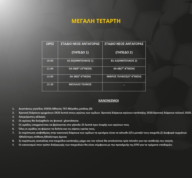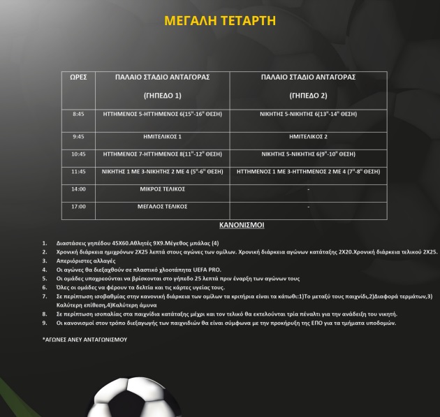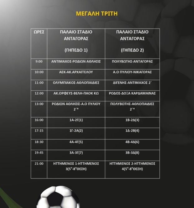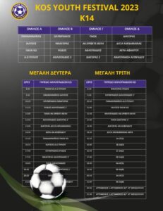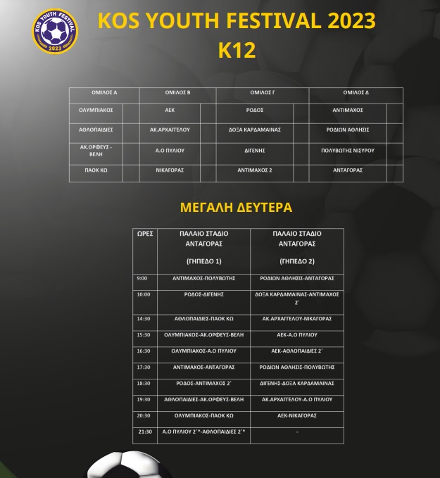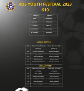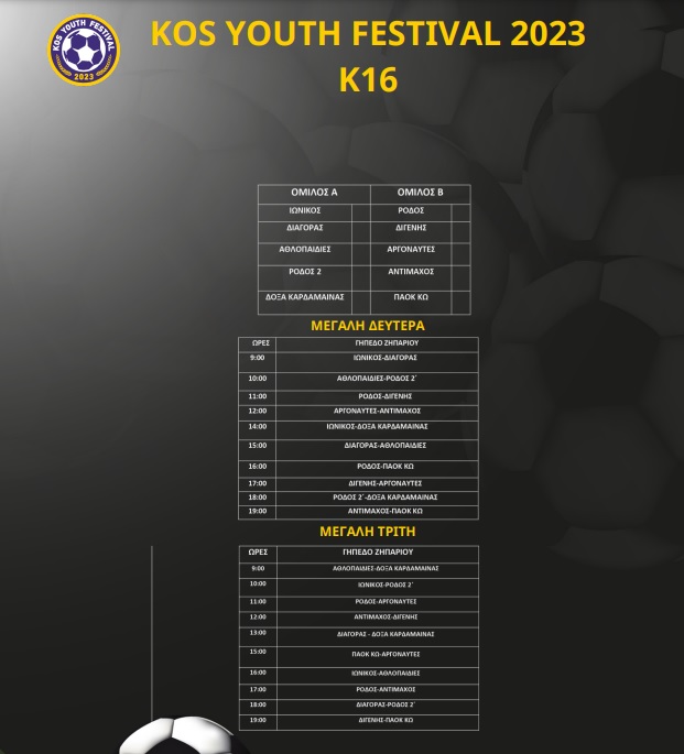 Ανακοινώθηκε απ’ την οργανωτική επιτροπή το πρόγραμμα του 2ου Kos Youth Festival το οποίο ξεκινά την Μεγάλη Δευτέρα και θα ολοκληρωθεί την Μεγάλη Τετάρτη. Τα παιχνίδια θα γίνουν στο Παλιό γήπεδο Ανταγόρας, στο Νέο στάδιο Ανταγόρας, στο γήπεδο του Α.Ο Αθλοπαιδιών Κω και στο γήπεδο Ζηπαρίου.