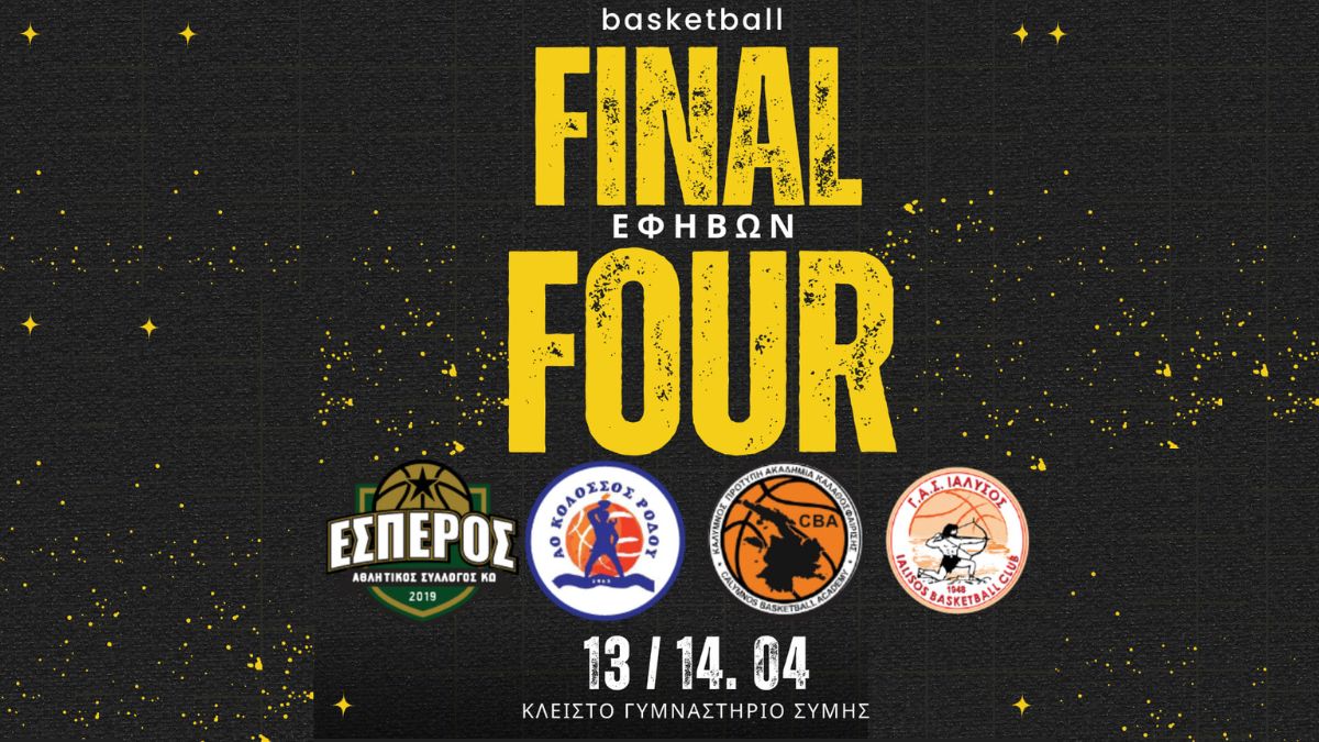 Ανακοινώθηκε το πρόγραμμα του Final-Four των εφήβων, που θα διεξαχθεί στο κλειστό γυμναστήριο της Σύμης. Στον πρώτο ημιτελικό (16:30) ο Έσπερος Κω θα παίξει με τον Κολοσσό και στον δεύτερο ημιτελικό (18:30) ο Γ.Α.Σ. Ιάλυσος θα παίξει με την Ακαδημία Καλύμνου. Ο μικρός τελικός θα διεξαχθεί την Κυριακή στις 10:30 και ο μεγάλος στις 13:00.