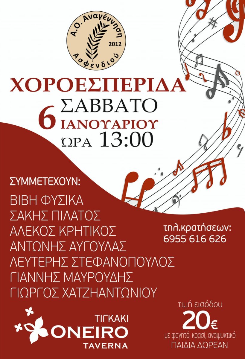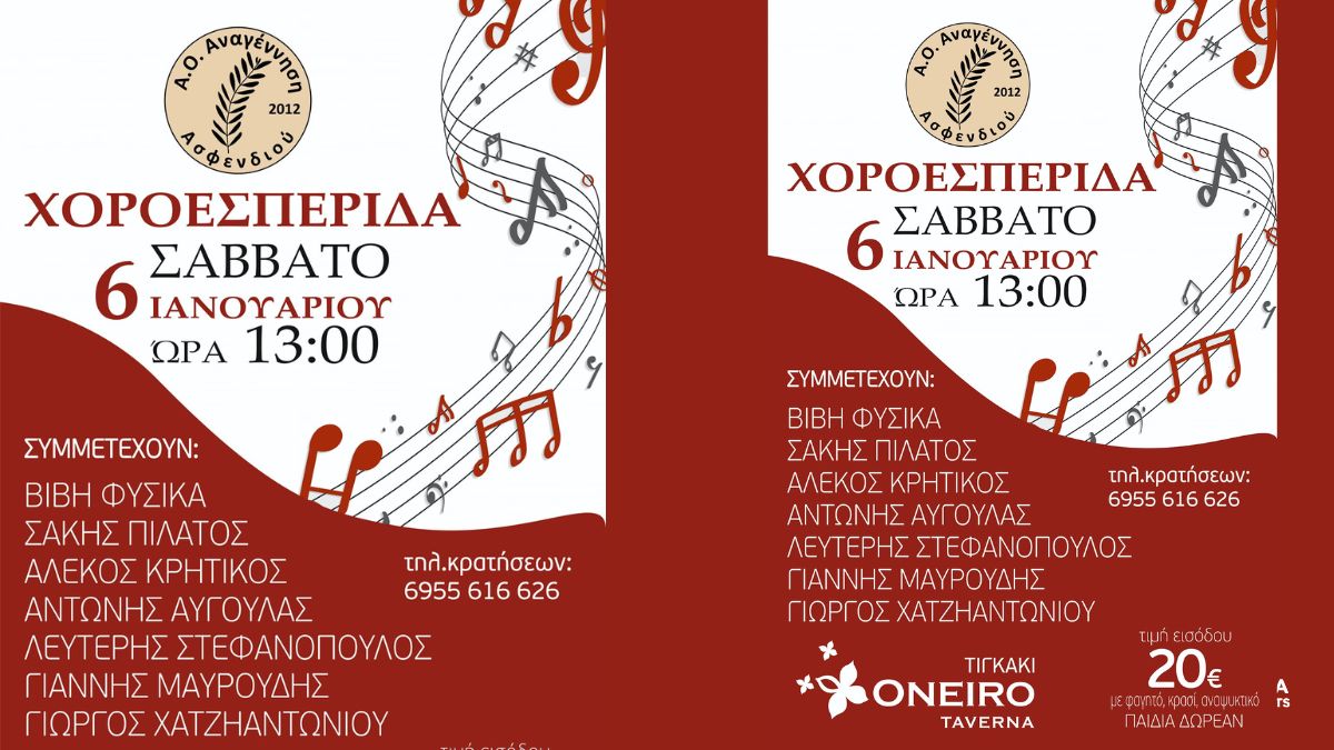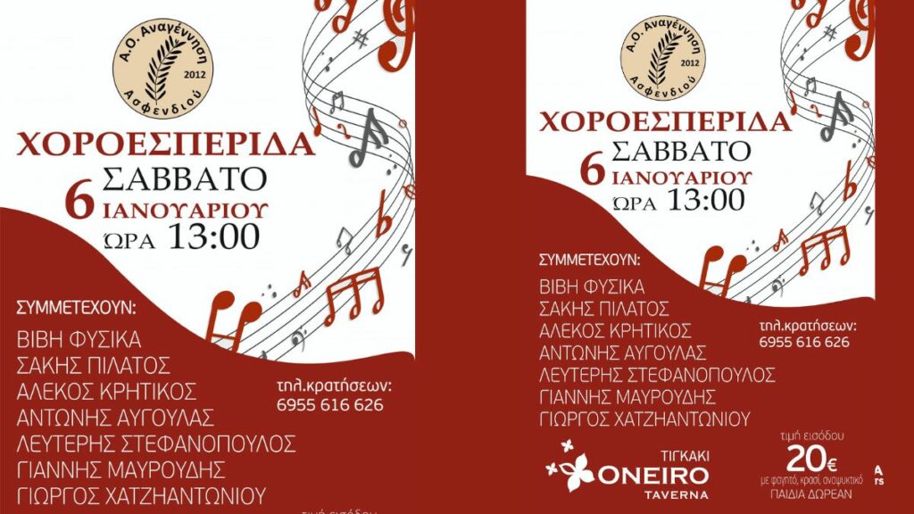 Ο Α.Ο Αναγέννηση Ασφενδιού σας προσκαλεί στην χοροεσπερίδα που διοργανώνει το Σάββατο 6 Ιανουαρίου 2024 και ώρα 13:00 μ.μ. στο εστιατόριο ONEIRO στο Τιγκάκι.