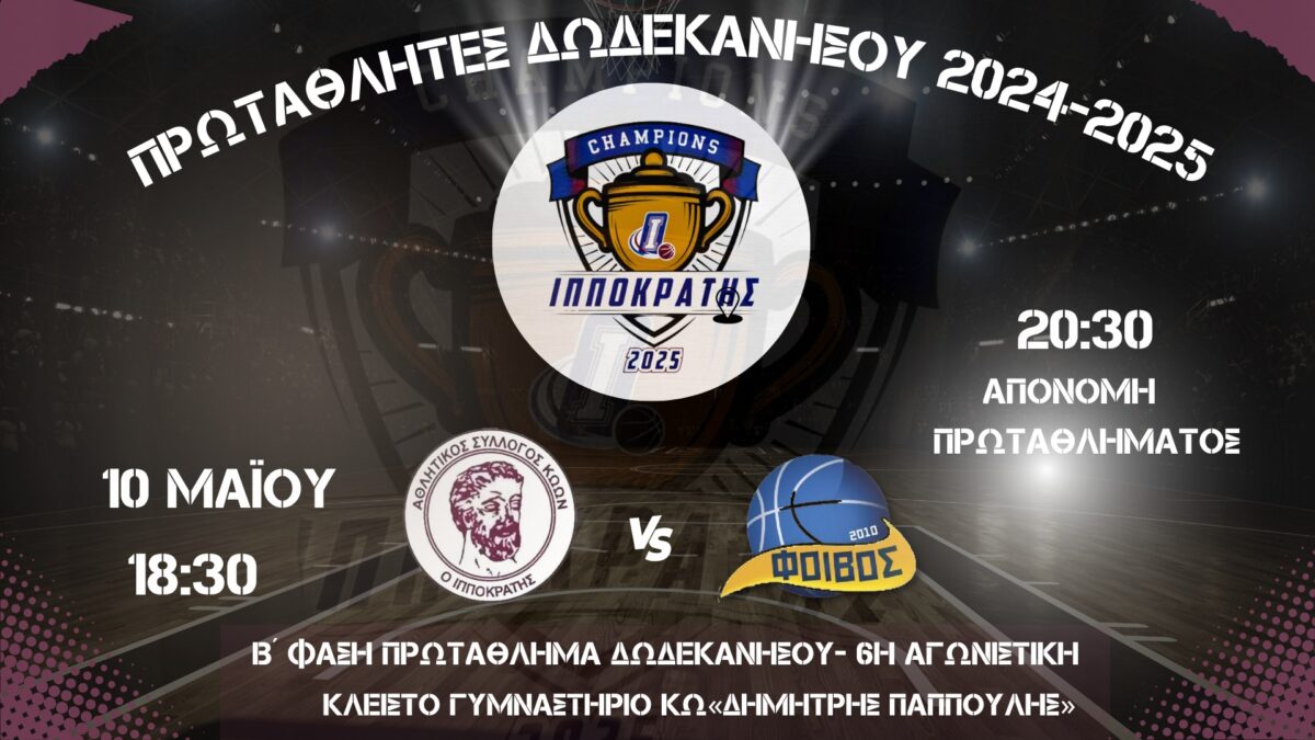 «Ώρα στέψης για το ανδρικό μας τμήμα το Σάββατο 10 Μαΐου στο κλειστό γυμναστήριο Κω «Δημήτρης Παππούλης». Μετά το φινάλε της τελευταίας αναμέτρησης της β’ φάσης του πρωταθλήματος κόντρα στον Φοίβο το Σάββατο στις 18:30 θα ακολουθήσει η απονομή του πρωταθλήματος και η φιέστα για τον τίτλο στα Δωδεκάνησα. Καλούμε τον φίλαθλο κόσμο να δώσει δυναμικό παρών για να γιορτάσουμε όλοι μαζί τον τίτλο».