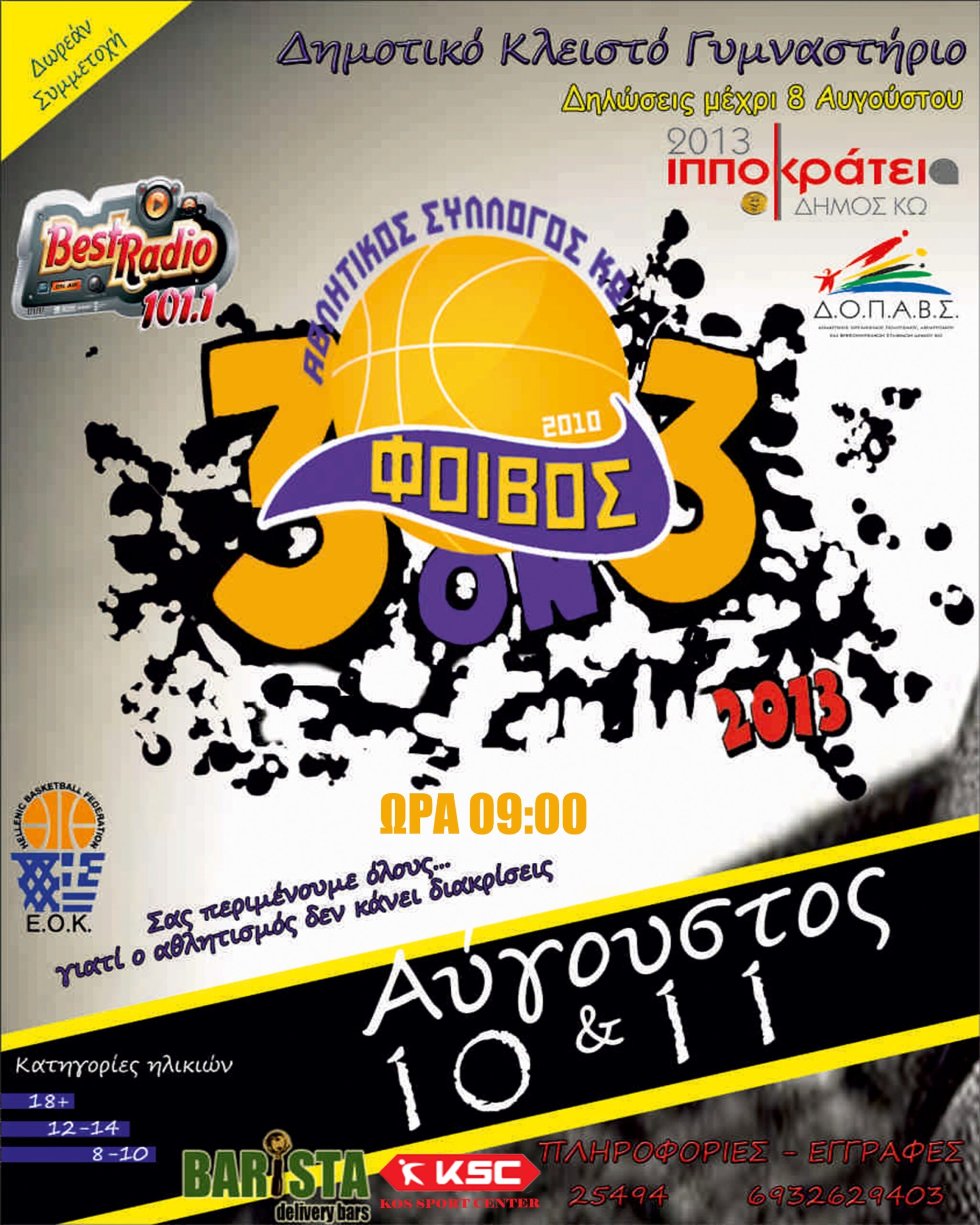 Ο Αθλητικός Σύλλογος Κω «ΦΟΙΒΟΣ» σε συνεργασία με τον Δημοτικό Οργανισμό Πολιτισμού, Αθλητισμού και Βρεφονηπιακών Σταθμών Δήμου Κω, διοργανώνουν Τουρνουά Μπάσκετ ««ΦΟΙΒΟΣ 3on3», το Σάββατο 10 και την Κυριακή 11 Αυγούστου 2013, στο Δημοτικό Κλειστό Γυμναστήριο Κω και ώρα 09:00.