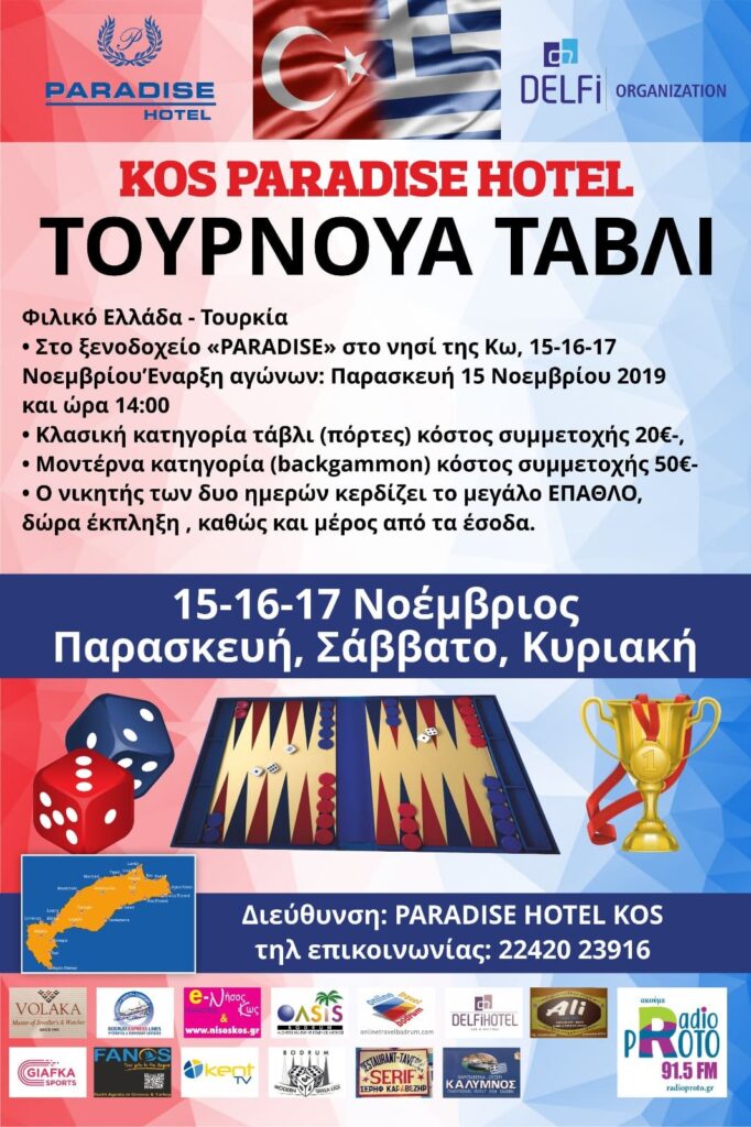 Ένα διαφορετικό τουρνουά τάβλι θα διεξαχθεί το Νοέμβριο στην Κω. Ένα τουρνουά ελληνοτουρκικής φιλίας με συμμετοχές παικτών από την Αλικαρνασσό και την Κω. Η φιλική διοργάνωση θα ξεκινήσει στις 15 Νοεμβρίου και αναμένονται πολλές συμμετοχές από την Τουρκία αλλά και την Κω.