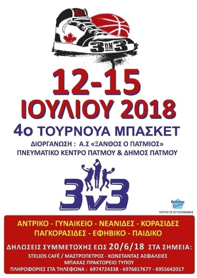 Από 12 έως 15 Ιουλίου θα γίνει το 4ο τουρνουά μπάσκετ 3 on 3 στην Πάτμο… Πρόκειται για μία συνδιοργάνωση του τοπικού Ξάνθου με το πνευματικό κέντρο Πάτμου και τον Δήμο.