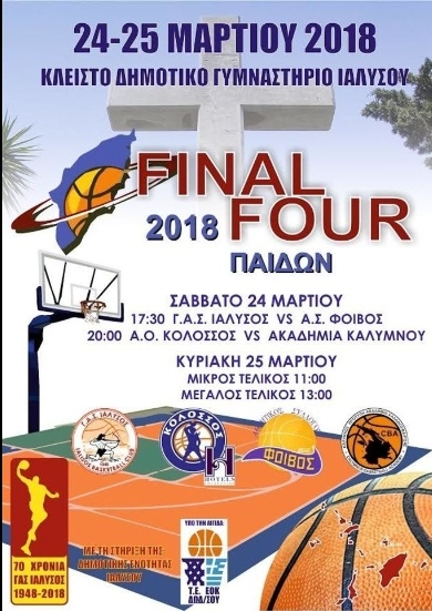 Με διοργανωτή τον Γ.Α.Σ. Ιάλυσος θα διεξαχθεί η τελική φάση του θεσμού, με τους ημιτελικούς να διεξάγονται το προσεχές Σάββατο. Στις 17:30 ο Γ.Α.Σ. Ιάλυσος θα παίξει με το Φοίβο Κω και στις 20:00 η Ακαδημία Καλύμνου με τον Κολοσσό. Ο μικρός τελικός θα διεξαχθεί το πρωί της Κυριακής (11:00) και ο μεγάλος στις 13:00. Ο νικητής του φάιναλ-φορ θα στεφθεί πρωταθλητής Δωδεκανήσου και θα συμμετέχει στην προκριματική φάση του πανελληνίου πρωταθλήματος, όπου θα αντιμετωπίσει τον Αίολο Μυτιλήνης, την Αναγέννηση Σάμου, λογικά τους Ίωνες από τη Χίο και τους πρωταθλητές Κρήτης και Κυκλάδων