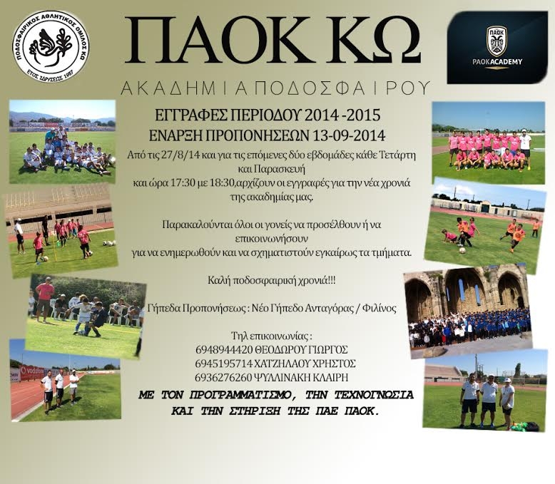 Απ’ τις 27/8/14 και για τις επόμενες δύο εβδομάδες κάθε Τετάρτη και Παρασκευή και ώρα 17:30 με 18:30 αρχίζουν οι εγγραφές για τη νέα χρονιά της ακαδημίας μας.