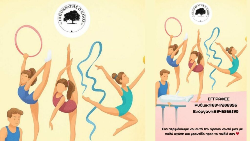 Ξεκίνησαν οι εγγραφές για τη νέα αθλητική χρονιά 2025-2026 στον Ιπποκράτη τον Κώο με τμήματα ρυθμικής, ενόργανης γυμναστικής και στίβου για παιδιά κάθε ηλικίας. Με έμφαση στις αξίες του αθλητισμού και την παιδαγωγική προσέγγιση, το σωματείο προσκαλεί μικρούς αθλητές να γίνουν μέρος μιας δυναμικής αθλητικής οικογένειας.