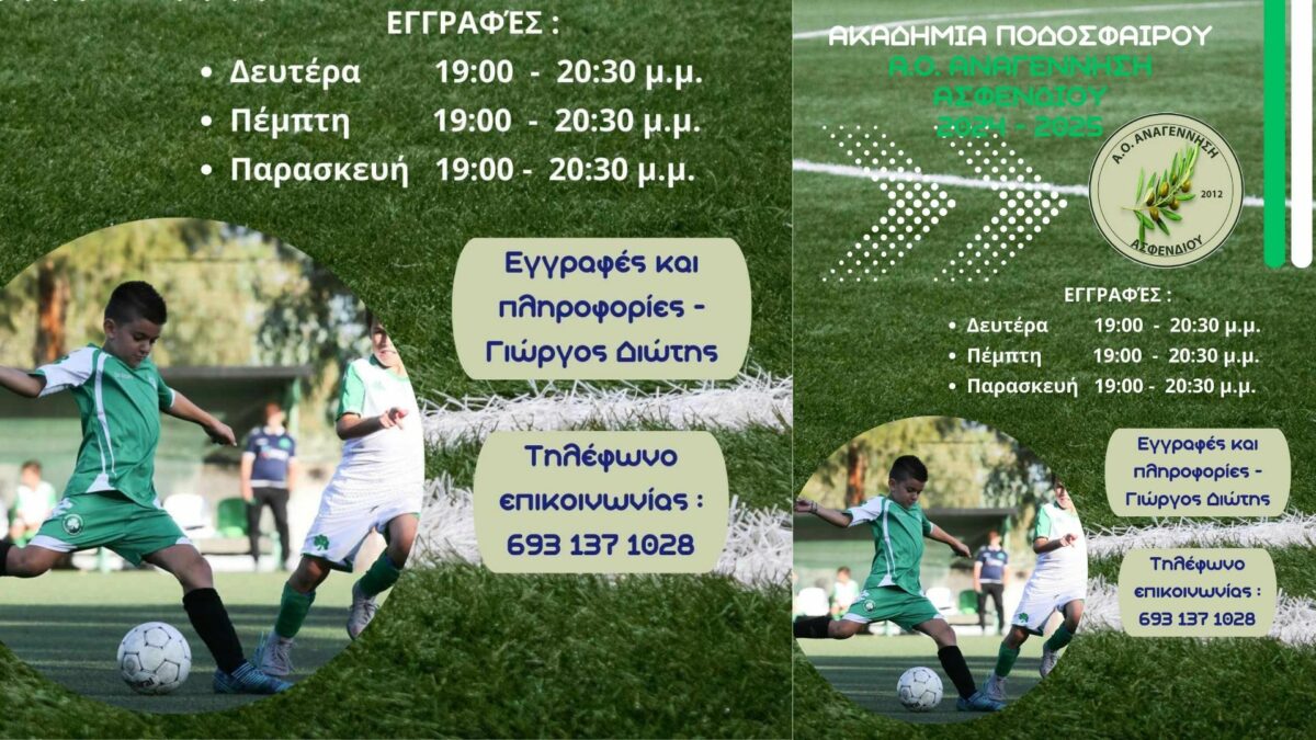 Ο Α.Ο. Αναγέννηση Ασφενδιού ανακοινώνει την έναρξη των εγγραφών στις ακαδημίες του συλλόγου μας για την ποδοσφαιρική περίοδο 2024 – 2025.