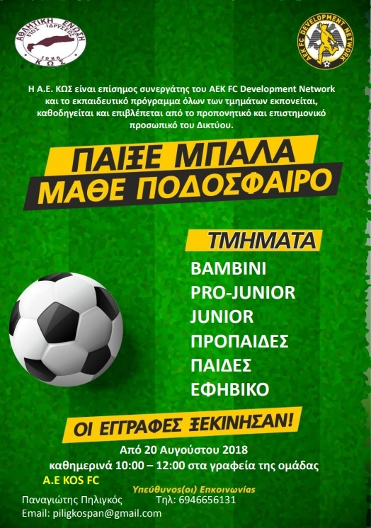 Η Α.Ε Κως ανακοινώνει ότι την Δευτέρα 20 Αυγούστου ξεκινούν οι εγγραφές της ακαδημίας μας, στα γραφεία της ομάδας στο Νέο στάδιο Ανταγόρας.