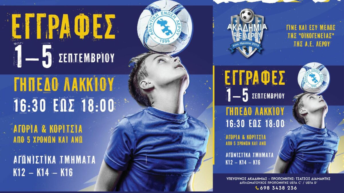 Η Ακαδημία της Α.Ε. Λέρου επιστρέφει δυναμικά για τη νέα σεζόν, με ανανεωμένο πλάνο και βασικό στόχο τη χαρά των παιδιών μέσα από το ποδόσφαιρο. Με έμφαση στη διασκέδαση, στη σωστή αγωνιστική εκπαίδευση αλλά και στη διαμόρφωση χαρακτήρων με σεβασμό, η Ακαδημία ανοίγει τις πόρτες της και καλεί μικρούς και μεγάλους να γίνουν μέλος της οικογένειας της.