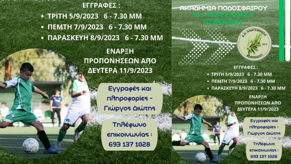 Ο Α.Ο. Αναγέννηση Ασφενδιού ανακοινώνει την έναρξη των εγγραφών στις ακαδημίες του συλλόγου μας για την ποδοσφαιρική περίοδο 2023/24.