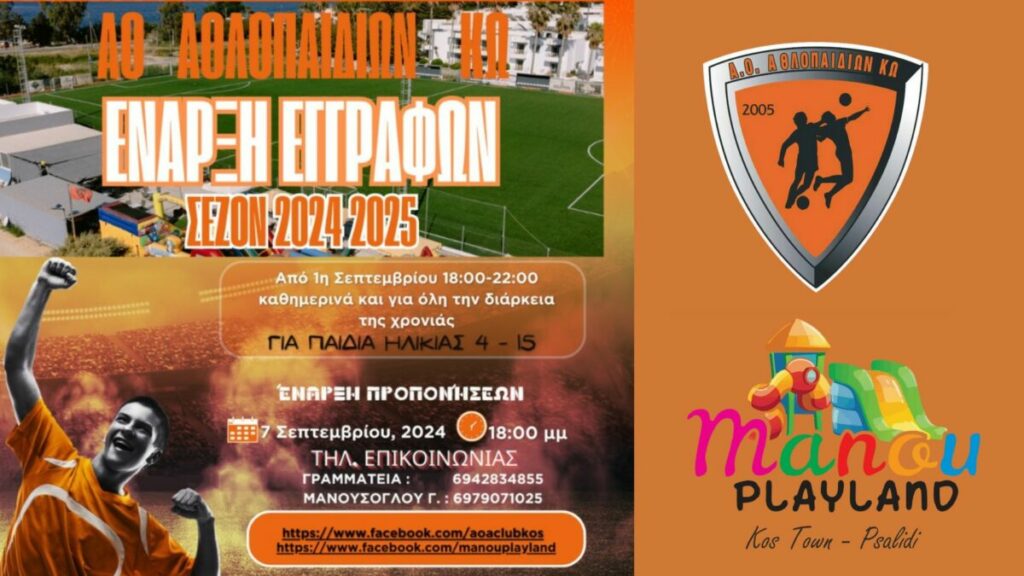 Από την 1η Σεπτεμβρίου ξεκινούν οι εγγραφές στον Α.Ο Αθλοπαιδιών Κω καθημερινά και για όλη την διάρκειας της χρονιάς απ’ τις 18:00 έως τις 22:00 για παιδιά ηλικίας από 4 έως 15 ετών.