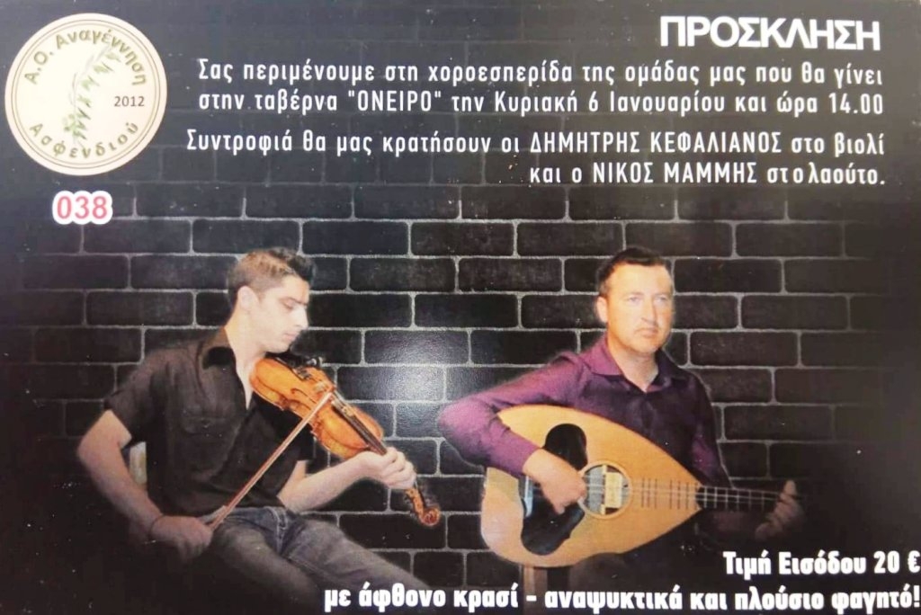 Την Κυριακή 6 Ιανουαρίου στις 14:00 στην Ταβέρνα “Όνειρο” η ομάδα μας έχει χοροεσπερίδα με τους Δημήτρη Κεφαλαιανό στο βιολί και Νίκο Μάμμη στο λαούτο. Τιμή Εισόδου 20€ με άφθονο κρασί-αναψυκτικά και πλούσιο φαγητό.