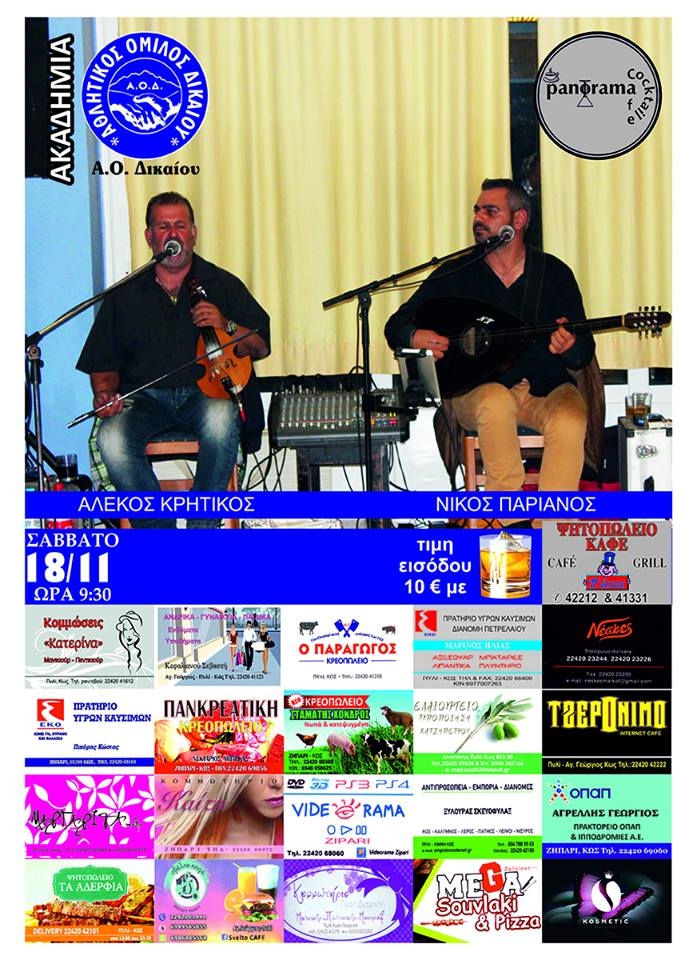 Χοροεσπερίδα με τους Αλέκο Κρητικό και Νίκο Παριανό διοργανώνει η ακαδημία του Α.Ο Δικαίου στο καφέ Πανόραμα στο Πυλί το Σάββατο 18 Νοεμβρίου.