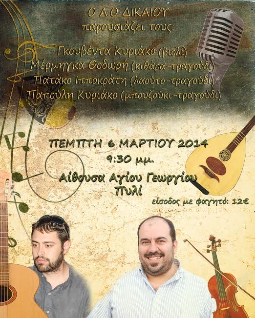Ο Α.Ο. Δικαίου σας προσκαλεί στην εκδήλωση του, στις 06/03/2014 στην αίθουσα του Αγίου Γεωργίου στο Πυλί με τους Γκουβέντα Κυριάκο (βιολί) τον Μέρμηγκα Θεόδωρο (κιθάρα,τραγούδι) Πατάκο Ιπποκράτη (κιθάρα,τραγούδι) και Παπούλη Κυριάκο (μπουζούκι,τραγούδι).
