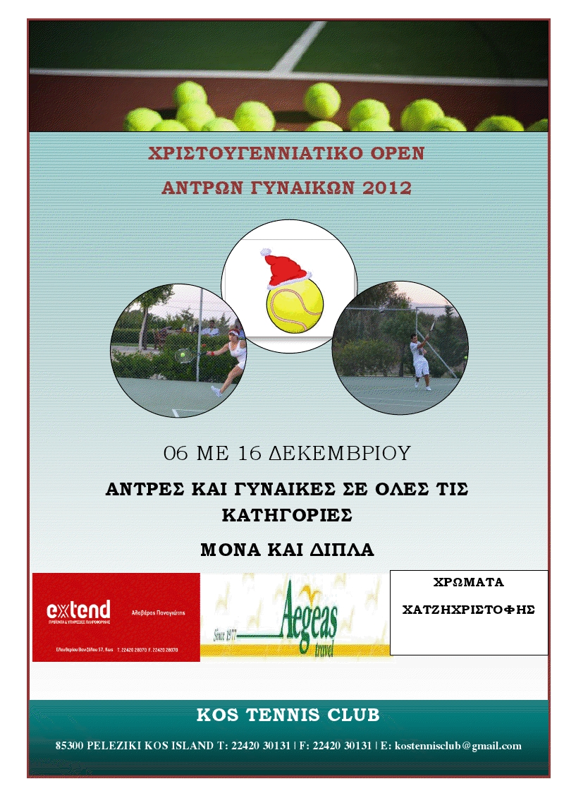Ο Όμιλος Αντισφαίρισης Κω σας προσκαλεί να στο Χριστουγεννιάτικο Tennis Open 2012 που θα πραγματοποιηθεί στις εγκαταστάσεις του ομίλου μας στο Πελεζίκι για να αποχαιρετήσουμε τη χρονιά στα γήπεδα. Δικαίωμα συμμετοχής έχουν όλοι οι φίλοι του αθλήματος, σε όλα τα επίπεδα και σε αγώνες μονών και διπλών. Οι αγώνες θα αρχίσουν το Σάββατο 06 Δεκεμβρίου και θα ολοκληρωθούν την Κυριακή 16 Δεκεμβρίου. Περισσότερες πληροφορίες στο τηλέφωνο, στο mail αλλά και την επίσημη σελίδα Facebook του ομίλου.